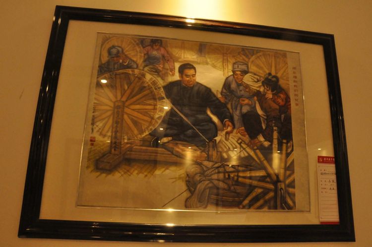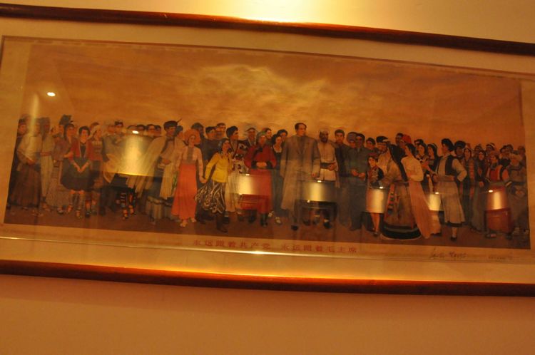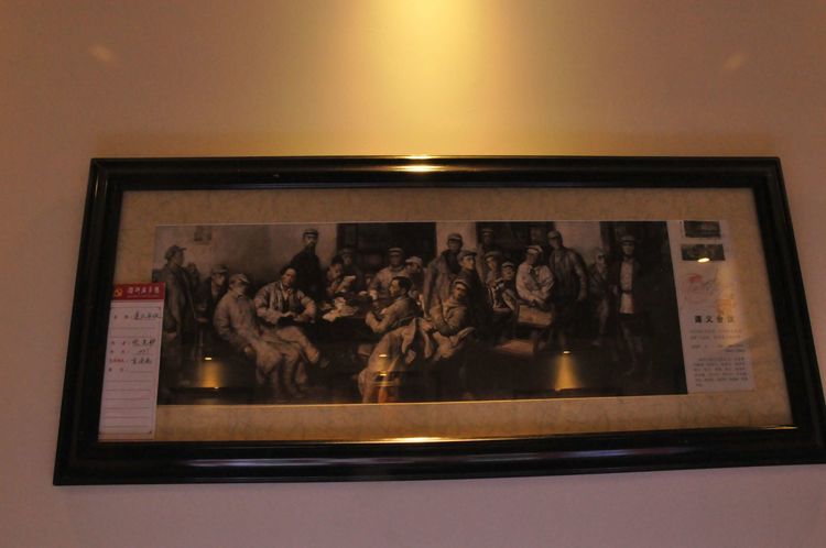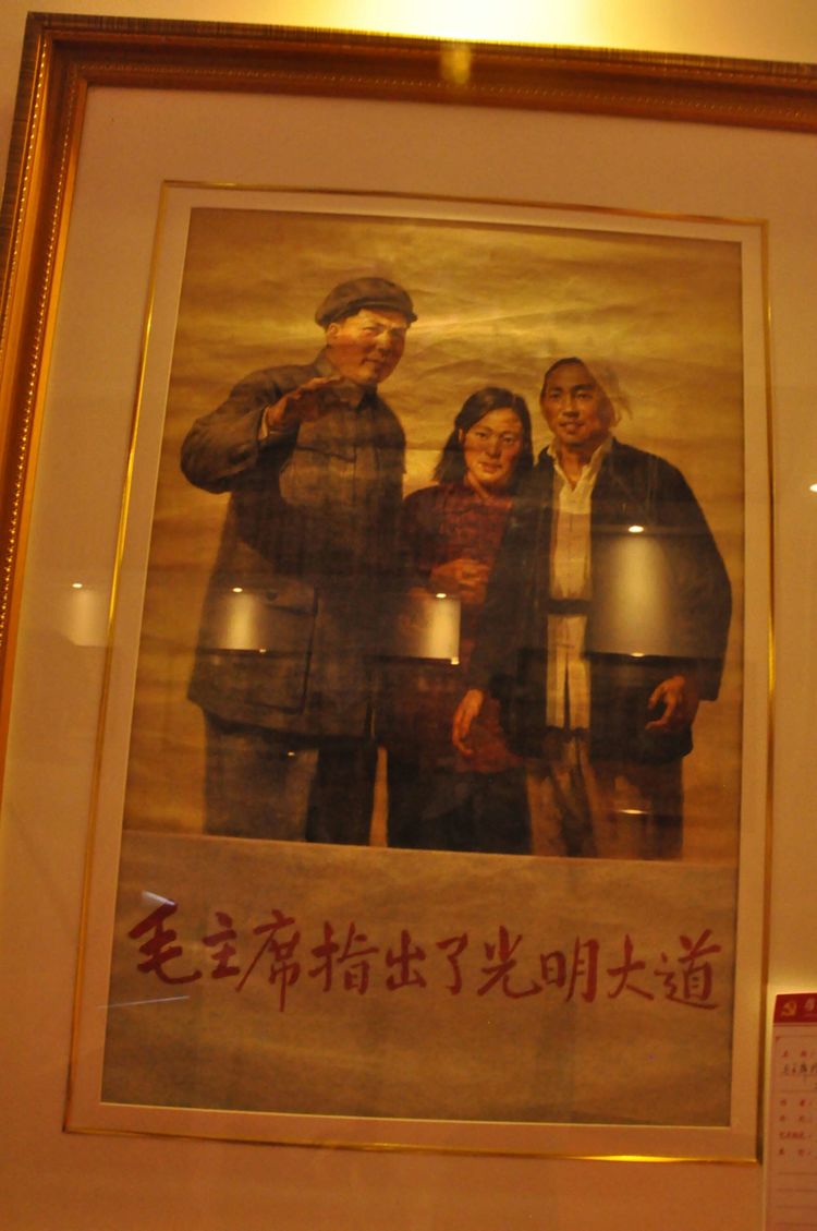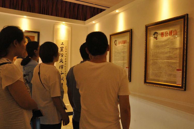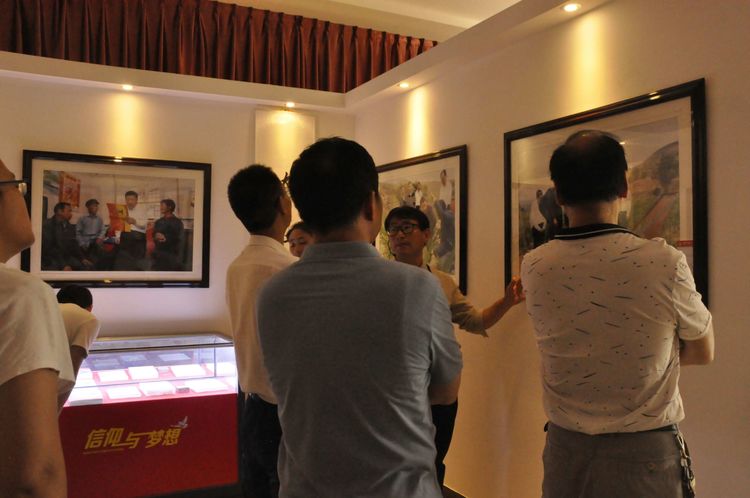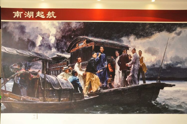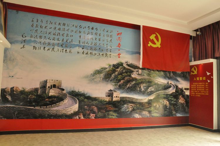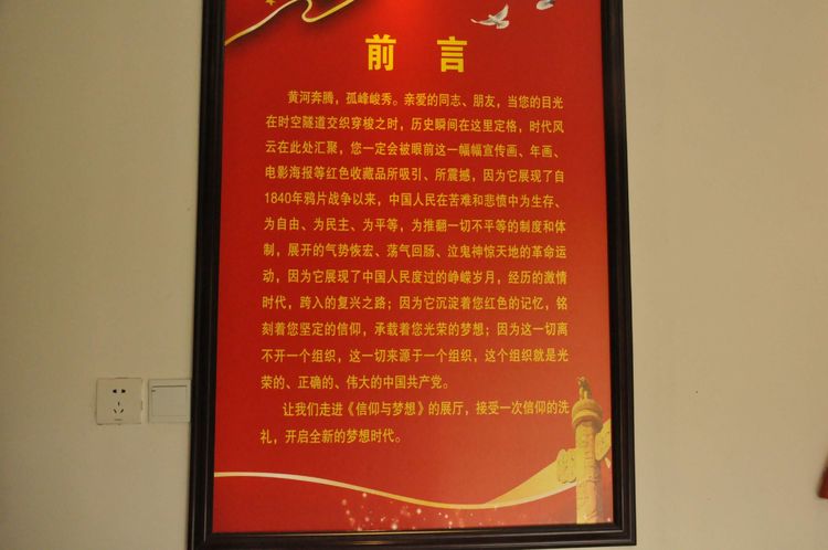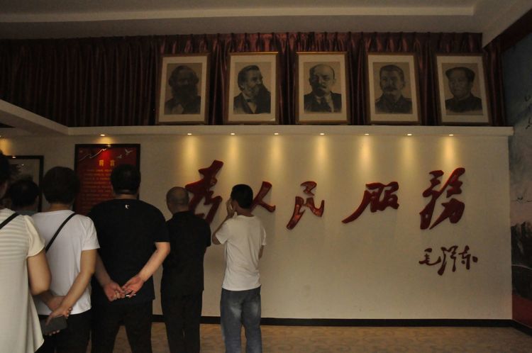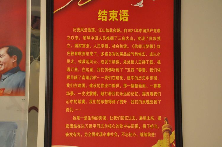 沿著山坡繼續(xù)往上,一座寬敞明亮的二層大展廳,以傳統(tǒng)的手工制作,農(nóng)耕家俱和紡織流程為主的實(shí)物展覽,以此教育宣揚(yáng),不忘初心,感恩社會(huì),感恩父輩的孝道文化。好在天氣不十分熱,立陡的山坡,讓每個(gè)人爬得氣喘噓噓。即將爬到山頂,一座紅色教育基地,《信仰與夢(mèng)想》展廳,進(jìn)入了人們的視線。踏入展廳大門,正面牆上懸掛著由左向右排列的,馬克思,恩格斯,列寧,斯大林,毛澤東五位導(dǎo)師和領(lǐng)袖畫(huà)像,下面是毛主席的《為人民服務(wù)》五個(gè)大字。右面山牆上是巨幅萬(wàn)里長(zhǎng)城國(guó)畫(huà)和鮮艷的中國(guó)共產(chǎn)黨黨旗和入黨誓詞。左面牆上是一幅《南湖起航》油畫(huà)。