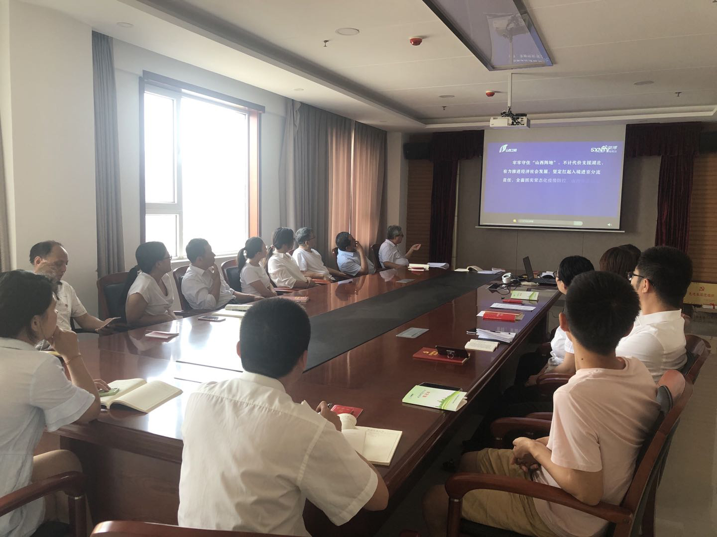 全體與會(huì)人員觀看《用忠誠(chéng)擔(dān)當(dāng)書寫勇毅前行的山西答卷--新冠肺炎疫情防控斗爭(zhēng)啟示錄》公益片。
