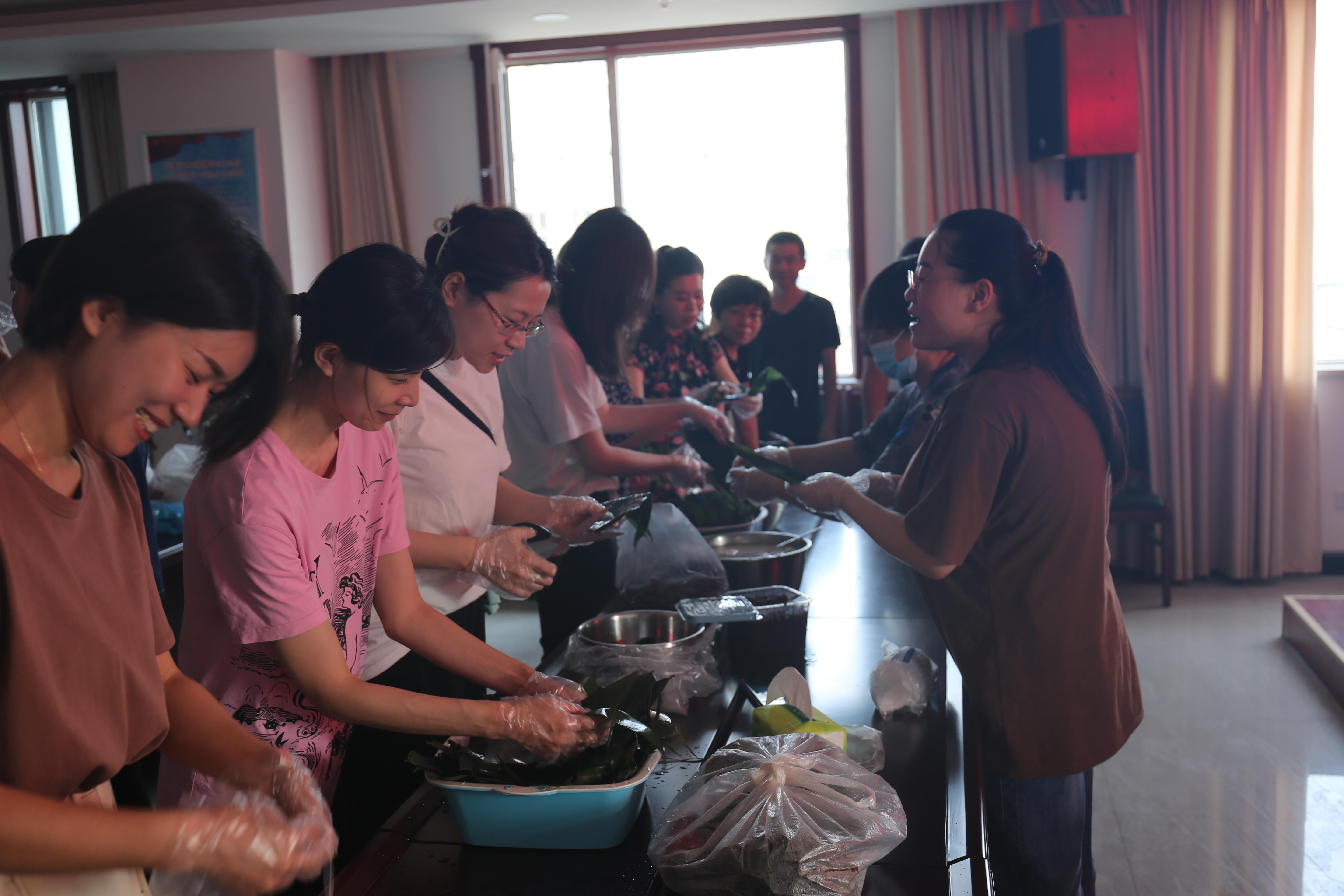 6月11日上午9時,公司參加活動的員工早早齊聚現(xiàn)場,開始準備?;顒蝇F(xiàn)場準備了糯米、粽葉、紅棗等材料,全體員工圍在一起包粽子。雖然大多數(shù)員工是第一次嘗試,但在包粽“高手”的教導下,員工合作起來包粽子、蒸晉糕,你理粽葉、我包粽,你洗紅棗,我填米,大家積極踴躍,一片歡聲笑語,不一會百十粽子和晉糕就已成型。包出粽子的形狀不一,有三角的有四角的,晉糕也是造型各異。伴隨著水蒸氣的沸騰,熱騰騰出鍋的粽子、晉糕,香氣襲人,大家品嘗著自己的勞動成果,內(nèi)心充滿了喜悅。