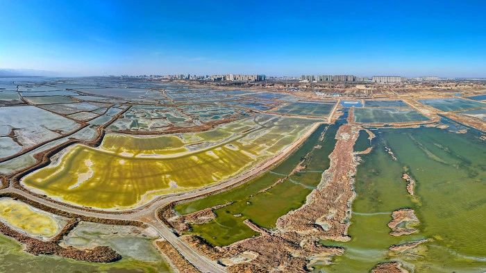 運(yùn)城鹽湖是世界三大硫酸鈉型內(nèi)陸鹽湖之一,總面積約132平方公里,形狀宛如一條玉帶,蜿蜒在中條山下。鹽湖中的藻類和鹽水蟲繁殖,造成湖水變幻出各種顏色,七彩兼?zhèn)?,宛如一個巨型調(diào)色盤,各色顏料飽滿流溢、異彩紛呈。