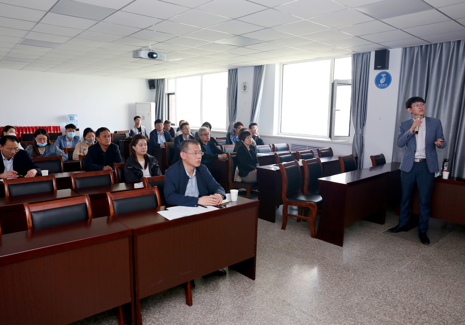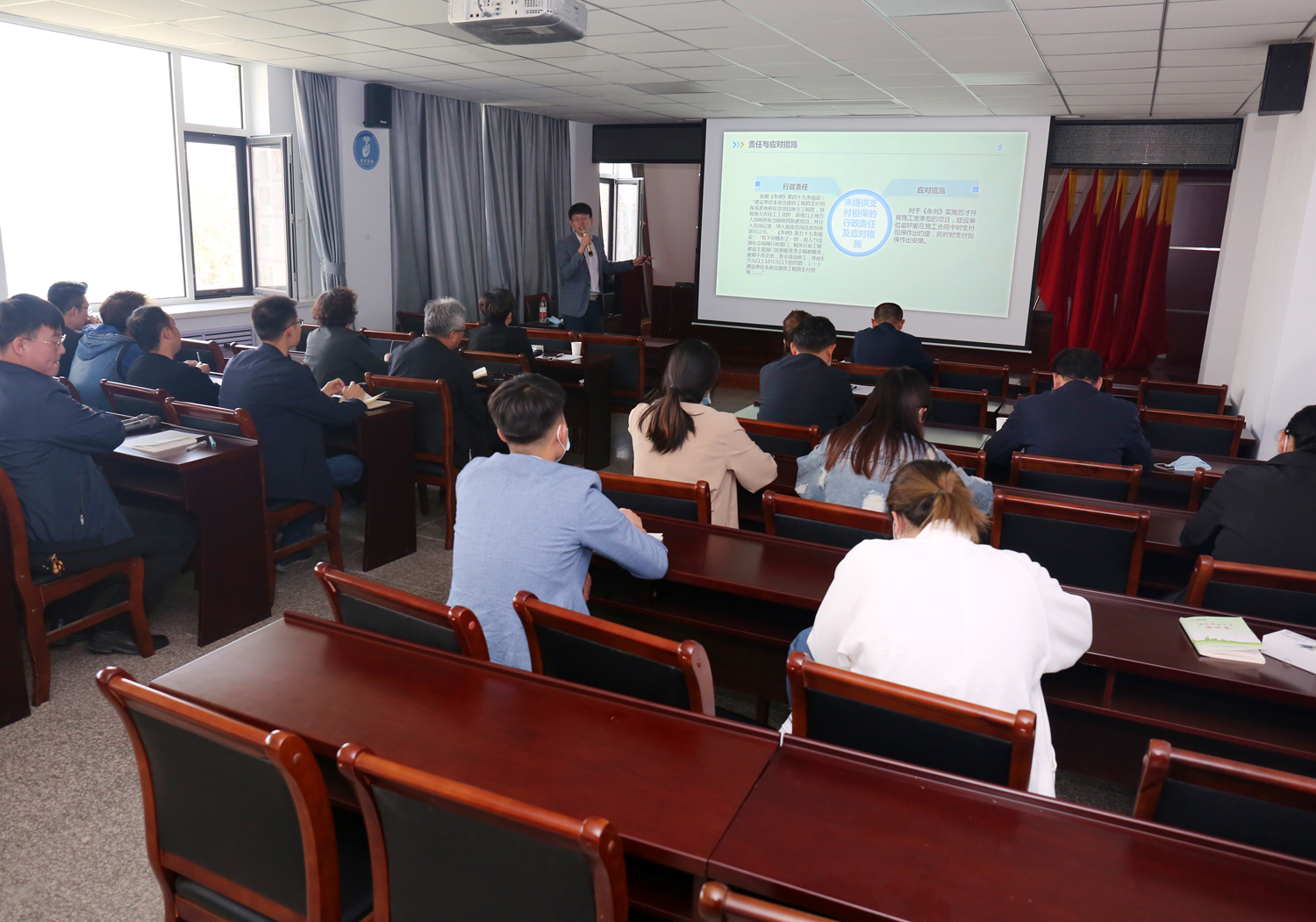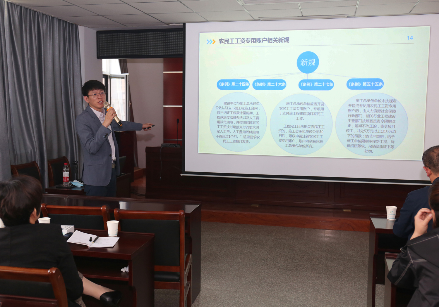 為規(guī)范農(nóng)民工工資支付行為,維護(hù)農(nóng)民工勞動報(bào)酬權(quán)益,切實(shí)保護(hù)農(nóng)民工合法權(quán)益,4月24日,我公司特邀請公司法律顧問單位山西衡霄律師事務(wù)所楊舟律師對國務(wù)院印發(fā)《保障農(nóng)民工工資支付條例》進(jìn)行授課培訓(xùn)。公司董事長兼總經(jīng)理崔作銘、副總經(jīng)理范永勝、下屬三家單位負(fù)責(zé)人、姚暹渠禹都段項(xiàng)目公司、鴨子池項(xiàng)目公司相關(guān)人員及公司機(jī)關(guān)人員參加培訓(xùn)。