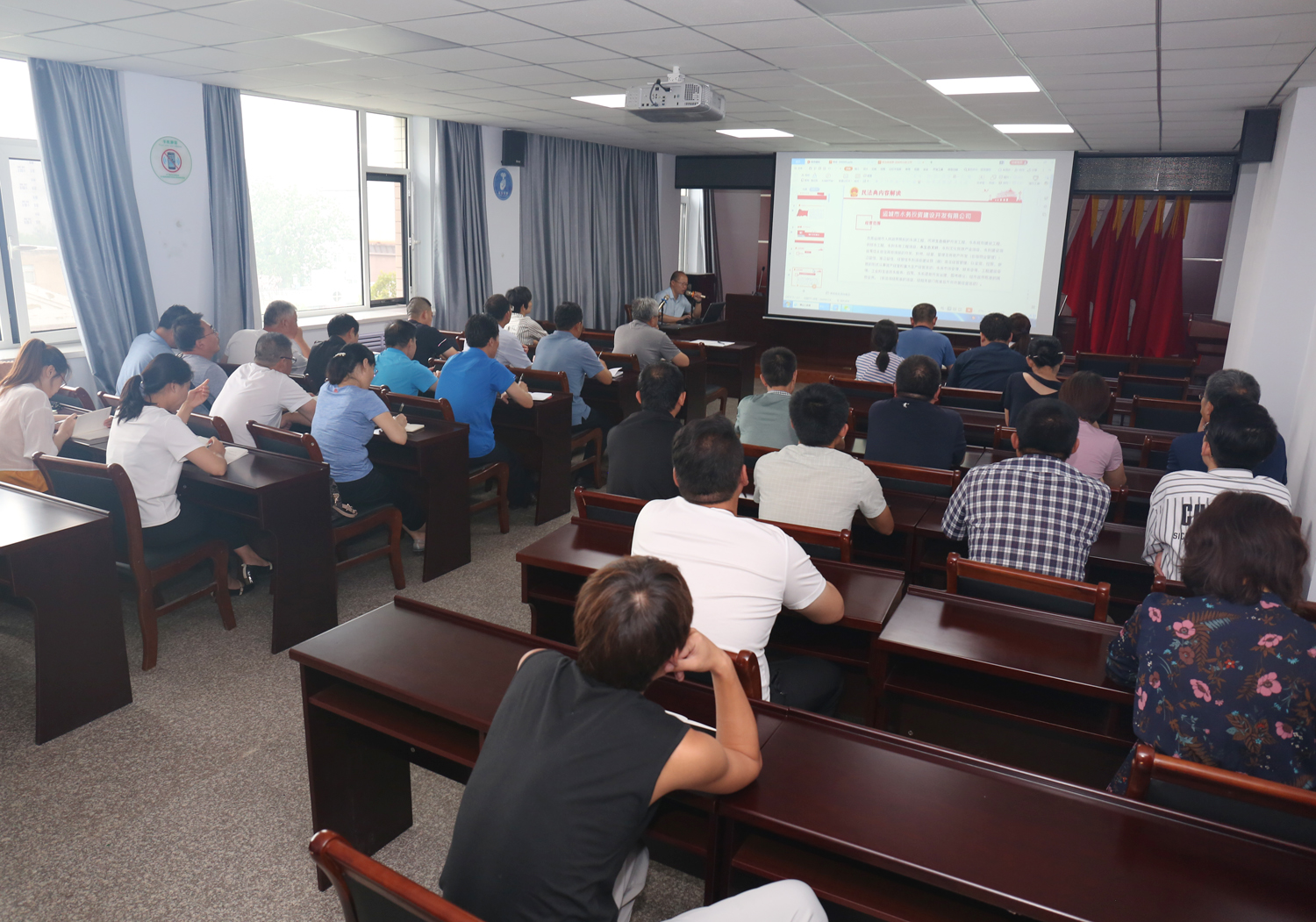 王銀良律師將《民法典》分成兩個部分解讀,第一部分為綠色原則解讀,第二部分為生活里的民法典。王銀良律師用通俗的語言和生動的例子,為大家深刻進(jìn)行了民法典法律解讀,授課內(nèi)容緊貼企業(yè)生產(chǎn)經(jīng)營,從綠色原則解讀了在水系規(guī)劃建設(shè)及生態(tài)環(huán)境保護(hù)的相關(guān)舉措上的法律制度和政策導(dǎo)向;授課內(nèi)容緊貼生活,從《婚姻法》、《繼承法》、到《物權(quán)法》,關(guān)系到每一個人生活的方方面面,使參會人員學(xué)習(xí)到了新的法律知識,理解和把握了《民法典》對日常生活的重要意義。